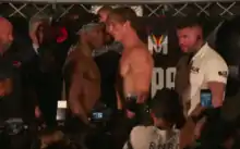 The weigh-in was held on 24 August 2018 and was co-hosted by the same host as the London press conference True Geordie as well as Michael Buffer. KSI weighed in at 187 lb (85 kg), 2 kg heavier than his previous fight with Joe Weller.[24] Meanwhile, Logan came in at 189 lb (86 kg). KSI took part in the weigh-in wearing a Chloe Bennet mask in an attempt to taunt Logan.[25] For the co-main event, Deji weighed in at 79 kg with Paul weighing 82.5 kg.[26]