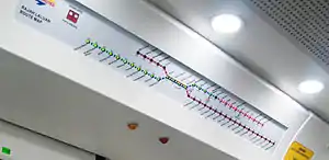 Designed for low dwell times and high passenger seating capacity, the trains have three double leaf doors per side. The driving motors have longitudinal seating only while the trailer feature a mixture of longitudinal and traverse 2+2 seating. It has wide gang-ways interconnecting each coach, allowing passengers to distribute effectively throughout the length of the train. However, two middle coaches of the class 92 is designated women's only coaches by its operator KTM, limiting full interactivity within the train set. Dynamic route maps located above doors details trains position relative to station in real-time. CCTVs and 3-pin power outlets are provided as further features. All trains have over-head air-conditioning systems to provide ventilation, dehumidification and comfortable temperature control.[8]