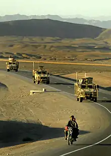 The Kabul–Kandahar Highway (NH0101) is a 483-kilometer (300 mi) road linking Afghanistan's two largest cities, Kabul and Kandahar, passing through Maidan Shar, Saydabad, Ghazni, and Qalati Ghilji.[1] This highway is a key portion of Afghanistan's national highway system or "National Highway 1". The entire highway from Kandahar to Kabul is on flat surface, with no mountain passes. Approximately 35 percent of Afghanistan's population lives within 50 km (31 mi) of the Kabul to Kandahar portion of the Ring Road.