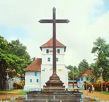 The year of 1599 had remarked with the arrival of Arch Bishop of Goa, Dom Alexis De Menesis to Kaduthuruthy. He believed that the Syriac rite followed by the St. Thomas Christians had the elements of Nesthorianism. He was intending to eliminate the involvement of the East Syriac Bishops and to get the solid sovereignty over the St. Thomas Christians. Portuguese scholar Anatonio De Gouve who was an aide to the Arch Bishop Menesis, gives a detailed description of Kaduthuruthy Valiapally in his book of Jornada of Dom Alexis De Menesis (1604). Bishop Dom Menesis sailed out from Goa and reached to Kaduthuruthy Valiapally in AD 1599. He stayed in kaduthuruthy to participate in the holy week celebrations of the Kaduthuruthy Vallyapalli and tried to attract the Southist Christians to Roman Catholic rite. Bishop Menesis had carried out the inaugural blessing of the Cross situated on the courtyard of this Church, during the Holy Friday of 1599. The famous liturgical celebration of "Purathu Namaskaram" (പുറത്തു നമസ്കാരം) is conducting on the base of this cross during the 3 Nombu Feast (3-Day Lent Feast). The base of the cross is adorned with many carvings and the relics of the Holy Cross of Jesus Christ bought in the 15th century had placed in a separate chamber of the base. The base which holds the Holy Relics of the Cross of Jesus Christ is 10 feet long, 10 feet breath and of 10 feet in height. There are many art works performed on the base of the cross like a scene of round dance performed by Southist Christians, a hunting scene, elephant, peacock, etc. On this base there are 153 lamps (ചുറ്റു വിളക്ക്) provided for the devotees to offer coconut oil, then to lighten the lamp by praying the Rosary of Virgin Mary. Devotes used to light the oil lamps during first Friday and 3-nombu feast either to get their wishes fulfilled or to express their sincere gratitude to the blessings they already received.