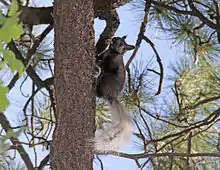 The Kaibab squirrel lives in ponderosa pine forests,[4] where it builds its nest out of twigs and pine needles. Kaibab squirrels, ponderosa pines, and the fungi which grow in the vicinity of the ponderosas exist in a symbiotic relationship. The squirrel eats acorns, fruit, and fungi (especially an underground truffle),[2] as well as the seeds, bark, and twigs of the trees where it makes its home. The Kaibab squirrel's most significant source of food is the seeds found within ponderosa pine cones.[5] Young squirrels are born between April and August.