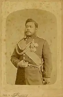 Kalākaua was a career politician who rose through the ranks of chiefs, and was named by Kamehameha III in 1844 as eligible to be king.[1] Kamehameha V, the last of the Kamehameha dynasty, died on December 12, 1872, without naming a successor to the throne. Under the 1864 Constitution of the Hawaiian Kingdom, if the king did not appoint a successor, a new king would be elected by the legislature to start a new royal line of succession.[2] Lunalilo became the first elected monarch of Hawaii, with Kalākaua holding the rank of Colonel on the royal military staff. Upon Lunalilo's death on February 3, 1874, a legislative election was held, with Kalākaua being sworn in as monarch on February 13.[3] Two weeks after taking office, he reorganized the Hawaiian military and restored the Household Guards recently abolished by Lunalilo.[4] Like his predecessors, he belonged to fraternal organizations, as a member of the freemasonry Lodge Le Progres de l’Oceanie,[5] and as the founding member of the Ancient Order of Foresters in Hawaii.[6]
