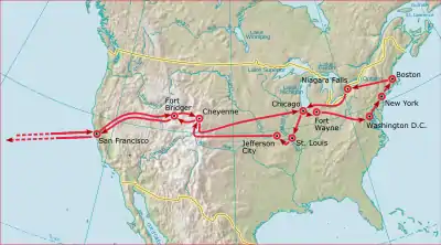 The royal party boarded three private cars provided by the rail company on December 5, and began their trip across the continent.[26] In addition to Dominis, Kapena, Mayor and Peirce, the king's official party now included Schofield, Wherry, and Lieutenant Commander William H. Whiting, a junior officer of the Benicia. From that point forward, writer Joseph Irwin accompanied the royal party as an embedded journalist for The Daily Alta California.[47]
