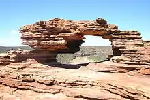 Kalbarri National Park preserves the inland desert regions of red and white striped Tumblagooda sandstone east of the town of Kalbarri, particularly the lower reaches of the Murchison River and its gorge, as well as the mouth of the river by Meanarra Hill.[2]