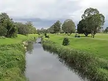 Kalinga is bounded by Kedron Brook to the north.[3] The Kedron Brook bikeway follows the brook on the suburb's north-east boundary with two bridges over the creek to Shaw Park in Wavell Heights (27.4041°S 153.0498°E) and to Toombul Terrace in Nundah (27.4081°S 153.0549°E). There is a third bridge over the creek (27.4045°S 153.0508°E) from the bikeway (but not part of the bikeway) to Carew and New Street in Nundah.[4]