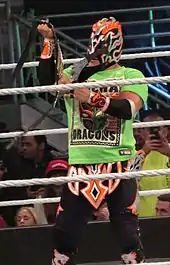 On the February 17, 2015 episode of Main Event, Kalisto made his main roster debut in a tag team match, where he and Sin Cara defeated Curtis Axel and Heath Slater.[86][87] On the March 30 episode of "Raw", Kalisto made his WWE television debut on Raw, where The Lucha Dragons and The New Day (Big E and Kofi Kingston) defeated then WWE Tag Team Champions Tyson Kidd and Cesaro and The Ascension in an eight-man tag team match.[88] On May 31, at Elimination Chamber, The Lucha Dragons competed in the first-ever tag team Elimination Chamber match for the WWE Tag Team Championship, but failed to win.[89] The Lucha Dragons received another title shot on August 23 at SummerSlam in a Fatal 4-Way match, but were once again unsuccessful.[90] In November, after Seth Rollins vacated the WWE World Heavyweight Championship due to a legitimate injury, WWE held a tournament to determine a new champion.[91] After defeating Ryback in his first round match on the November 12 SmackDown,[92] Kalisto was eliminated in the quarterfinals on the November 16 episode of Raw by Alberto Del Rio.[93] On December 13, at TLC: Tables, Ladders and Chairs, the Lucha Dragons received another shot at the WWE Tag Team Championship, but were defeated by The New Day in a triple-threat ladder match, which also included The Usos (Jey and Jimmy).[94] The Lucha Dragons once again failed to win the WWE Tag Team Championship on the December 22 Super SmackDown Live!, where they were defeated by The New Day.[95]