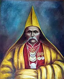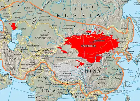 In January 1771 the oppression of Tsarist administration forced the larger part of Kalmyks (33 thousand households, or approximately 170,000–200,000 people) to migrate to Dzungaria.[12] [13][14] Ubashi Khan, the great-grandson of Ayuka Khan and the last Kalmyk Khan, decided to return his people to their ancestral homeland, Dzungaria, and restore the Dzungar Khanate and Mongolian independence.[15] As C.D Barkman notes, "It is quite clear that the Torghuts had not intended to surrender the Chinese, but had hoped to lead an independent existence in Dzungaria."[16]