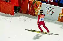 At the 2014 Winter Olympics in Sochi, Russia, Stoch entered as a medal favorite. On 9 February 2014 after qualifying easily in the first competition on the normal hill, he then landed the longest jumps in both rounds of the finals to win the title of Olympic Champion 2014.[5] He won by 12.7 points, the fourth- largest margin of victory in a men's normal hill at the Winter Olympic Games. It was Poland's first Olympic ski jumping gold medal since Wojciech Fortuna won the large hill at the 1972 Olympics. While competing he wore a helmet painted in military green, in tribute to the Polish Air Force (with a red & white Polish Air Force checkerboard insignia on the left side of his helmet.). On 15 February 2014 – Kamil Stoch won his second gold medal, this time on the large hill, becoming third man in history to win both hills individual events in single Olympics after Matti Nykänen in Calgary 1988 and Simon Ammann in Salt Lake City 2002, Vancouver 2010.[6] He jumped 139 m and 132.5 m. His advantage over second Japanese Noriaki Kasai was 1.3 points and 3.9 points over third Slovene Peter Prevc.[7]