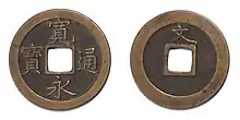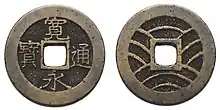 Kan'ei Tsūhō (Kyūjitai: 寛永通寳; Shinjitai: 寛永通宝) was an inscription used on Japanese mon coins from 1626 until 1868 during the Edo period. In 1636, the Kan'ei Tsūhō coin was introduced by the government of the Tokugawa shogunate as a means to standardise copper coins and keep up a sufficient supply of copper coinage, being the first government minted copper coin in 700 years. The government adopted them from after their successful introduction in the Mito domain 10 years prior during the 3rd year of the Kan'ei era. These coins would become the daily currency of the common people and would be used for small payments.[3][4][5] Due to the isolationist policies of the Tokugawa shogunate, the outflow of currency halted and Kan'ei Tsūhō coins would continue to stay the main coin circulating in Japan. Kan'ei Tsūhō were minted for 230 years despite the fact that the Kan'ei era ended in 1643. Kan'ei Tsūhō coins would continue to bear the Kan'ei legend, even when a new denomination of the coin was introduced a century later. They were not all uniform as the shogunate had intended, as the mintage was outsourced to regional and local merchants who would cast them at varying weights and sizes, as well as occasionally with local mint marks. By the 1650s, 16 private mints were operating for the production of Kan'ei Tsūhō coins all over Japan.[6] In 1738, the government authorised the manufacture of iron Kan'ei Tsūhō 1 mon coins, and in 1866 (just before the end of the Edo period) iron 4 mon Kan'ei Tsūhō were authorised. While iron coins were being minted the quality of copper coins would decrease due to frequent debasements.