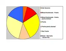 The terrain of Kandiyohi County consists of rolling hills, partly wooded, mostly devoted to agriculture.[6] The territory slopes to the south and west, with the highest point near its northeastern corner, at 1,306' (398m) ASL.[7] The county has a total area of 862 square miles (2,230 km2), of which 797 square miles (2,060 km2) are land and 66 square miles (170 km2) (7.6%) are covered by water.[8] Kandiyohi County is one of seven southern Minnesota counties that have no forest soils; only prairie ecosystems of savannas and prairies exist.