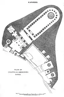 What strikes every visitor to these Kanheri caves is the number of water cisterns, most of the caves being furnished with its own cistern at the side of the front court, and these being filled all the year round with pure water. In front of many of the caves too there are holes in the floor of the court, and over their facades are mortices cut in the rock as footings for posts, and holdings for wooden rafters to support a covering to shelter the front of the caves during the monsoon.[13]