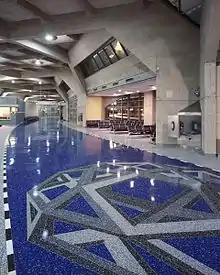 Following the renovations, all three terminals included blue terrazzo floors[14] which were created by artists Kristin Jones and Andrew Ginzel (winning a 2002 Honor Award from The National Terrazzo and Mosaic Association). Additionally, updated arrival/departure screens were added, and restrooms and concessions were made available inside passenger holding areas. In May 2007, the final portion of the project, a new rental car facility and additional art fixtures, were completed.