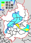Map of Kanzaki District with Meiji period (1890) area in yellow.