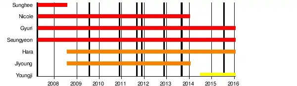The group originally started off as a quartet and made their debut in March 2007 with their first studio album The First Blooming and its single "Break It" while displaying a strong female image and a mature R&B sound. Expectations for the group were big because they were considered as successors to their senior labelmate, Fin.K.L. However, their debut was not well received by the public and was a commercial failure. The following year, Kim Sung-hee departed the group due to parental pressure, and members Goo Hara and Kang Jiyoung were brought in.[2] After their addition, the group also changed their musical style and their image to the "pretty but natural" appeal, releasing their first mini-album, Rock U in July 2008.[3] They achieved their first number one song with "Honey" (2009).[4] In July 2009, the group released their second studio album, Revolution and spawned the hit single "Mister", whose choreography featured the "butt-dance", that helped increase the group's popularity within East Asia.[5] Their follow-up singles including "Lupin" (2010), "Jumping" (2010), "Step" (2011), and "Pandora" (2012) were also successful and helped further establish the group within the Korean music industry. The group were ranked at No. 6 and No. 5 in Gallup Korea in 2009 and 2010 respectively, thus making them the second best girl group in Korea for 2010. They were also ranked at No. 4 and 13 in February 2012 and 2013's Forbes Korea Power Celebrity list, respectively.[6]