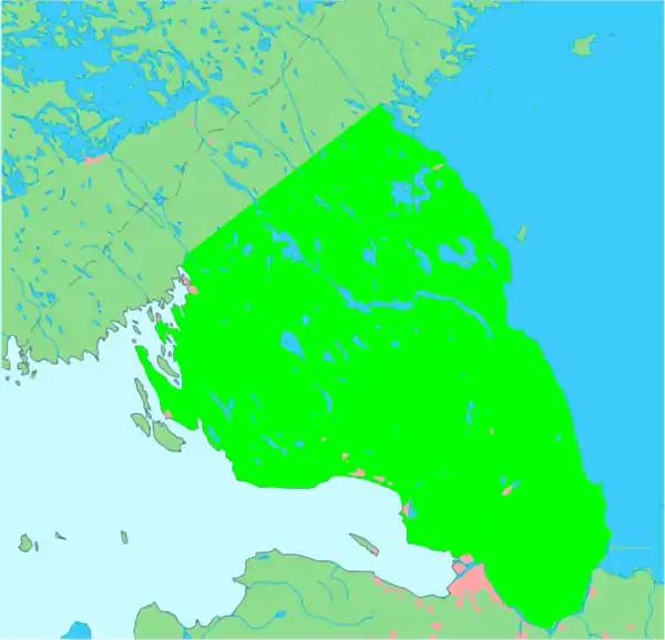 The Karelian Isthmus (Russian: Карельский перешеек, romanized: Karelsky peresheyek; Finnish: Karjalankannas; Swedish: Karelska näset) is the approximately 45–110 km (30–70 mi) wide stretch of land, situated between the Gulf of Finland and Lake Ladoga in northwestern Russia, to the north of the River Neva.[1] Its northwestern boundary is a line from the Bay of Vyborg to the westernmost point of Lake Ladoga, Pekonlahti. If the Karelian Isthmus is defined as the entire territory of present-day Saint Petersburg and Leningrad Oblast to the north of the Neva and also a tiny part of the Republic of Karelia, the isthmus' area covers about 15,000 km2 (6,000 sq mi).
