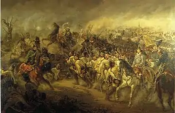 In the course of the battle, Jourdan's forces were supposed to engage in simultaneous attacks on the left, center and right of the Austrian line.[28] On the French right, Souham's and Ferino's Corps met with strong resistance and were stopped; on the French left, Lefebvre's troops charged with such force that the Austrians were pushed back. Having stopped Souham's and Ferino's assault, Charles had troops available to counter Lefebvre's force. At that point, Vandamme's men moved into action.[29] Because Souham's assault at the center had been stalled, Charles still had enough men to turn part of his force to fight this new threat, but the Austrians were hard pressed and the action furious. At one point, Charles attempted to lead his eight battalions of Hungarian grenadiers into action, to the dismay of the old soldiers. Fürstenberg reportedly said that while he lived, he would not leave this post (at the head of the grenadiers) and the Archduke should not dismount and fight.[30] As Fürstenberg led the Hungarian grenadiers into the battle, he was cut down by a canister and case shot employed by the French.[31] Although he was carried alive off the field, he died almost immediately. Charles ultimately did lead his grenadiers into battle, and reportedly his personal bravery rallied his troops to push back the French.[32] After the battle, someone removed Fürstenberg's wedding ring and returned it to his wife in Prague, with news of his death; Fürstenberg was buried at the battlefield cemetery in Stockach, and his cousin erected a small monument there,[33] but in 1857, his body was moved to the family cemetery, Maria Hof at Neudingen, near Donaueschingen.[34]
