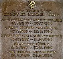 During World War II, Thüngen served on the Eastern Front, in 1942 and 1943 with the 18th Panzer Division. On 6 April 1943 he was awarded the Knight's Cross of the Iron Cross.[1] On 20 July 1944, he was appointed by the conspirators as the commander of the defense group III (Berlin), succeeding the arrested General Joachim von Kortzfleisch.[2] He did not follow the conspirators' orders and later took part in the interrogation of Major Hans-Ulrich von Oertzen, a supporter of the plot under his command.