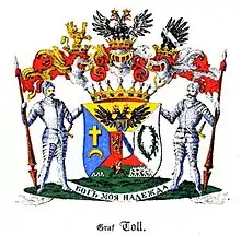 He was named general-adjutant to the emperor in 1823, and infantry general in 1825. In the 1829 campaign against the Turks, General von Toll was chief of the general staff. For his role in the victory at Kulevicha he was granted the title of count by Tsar Nicholas I. During the Polish campaign of 1831, he served as chief of the general staff of Hans Karl von Diebitsch, and succeeded von Diebitsch upon his death. He took part in the siege of Warsaw by Paskevich in September 1831 and succeeded wounded Paskevich as a commander in chief during the final stages of the assault of the city. In 1833 he served on the state council as minister of transport, in which capacity he paid special attention to the Institute of Transport Engineers.[3] He subsequently retired to his estate in the Governorate of Estonia.