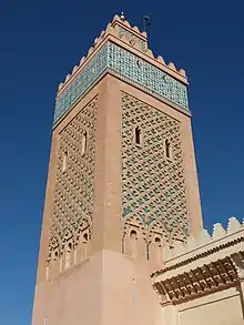The main part of the minaret has plain walls made of rubble stone up to the level of the mosque's roof, at which point the rest of the minaret is made of brick and the decoration begins. From here, on each of the almost identical four sides, three narrow horseshoe arches are topped by larger polylobed arches ("polylobed" meaning that it is made up of multiple smaller half-circles). In between these arches are thin engaged columns that were once all covered in coloured faience (ceramic), which remains on some of them.[2] This set of elements then blends into the much larger decorative facades above them. These facades feature a wide interlacing sebka pattern (a common Maghrebi motif that roughly resembles palmettes or fleur-de-lys) sculpted in brick and filled-in with green faience.[3] Although the decoration of the four sides of the minaret is almost the same, there are small differences between the north and south facades on the one hand and the east and west facades on the other, with details of the shapes of the sebka pattern and of the polylobed arches on the lower facade varying slightly.[2] This type of alternation was repeated in other contemporary and later minarets (e.g. the Hassan Tower in Rabat or the Chrabliyine Mosque in Fes).[6][7]
