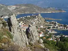 The houses of the town are slender and characterised by wooden balconies and windows of the Anatolian type.[10] Behind the waterfront, many houses are still in a ruinous state. At the entrance to the harbour, on the east side, stand the single story remnants of the former Italian government house (palazzina della delegazione), erected in 1926 by the Italian architect Florestano Di Fausto, who also designed some of the most important buildings of the Italian period in Rhodes.[11] Nearby is the island's former Ottoman mosque which dates from the second half of the 18th century and which has been restored and re-opened as a museum since 2007. From here starts the town's quay, which runs along all three sides of the harbour. The central square —Plateia Ethelondon Kastellórizou ("Kastellorizo Volunteers' Square")—lies at the midpoint of the eastern side, near the vessel dock. On the opposite side of the harbour one has a good view from this vantage of Pera Meria, the western quay, and the monasteries of Profitis Ilías and Aghia Triadha, the former now an army base.