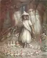 While she was still in school, Greenaway received commissions for children's book illustrations. The first came in 1867 for a frontispiece for Infant Amusements, setting a path towards specialization in children's books.[10] Her reputation was built on the awards she had won while completing the National Art Courses, and buttressed with early exhibitions. She exhibited a set of fairy watercolours in 1868, which she sold to W. J. Loftie, publisher of People's Magazine.[10] He set them to verse and printed them in his magazine. A year later Frederick Warne & Co purchased six illustrations for a toy book edition of "Diamonds and Toads";[11] printed by Joseph Martin Kronheim.[12] which took a year to complete.[7] In 1871 Gall & Inglis published an edition of Madame d'Aulnoy's fairy tales, which she illustrated.[11] That year she continued with her classes and earned more than 70 pounds.[7]