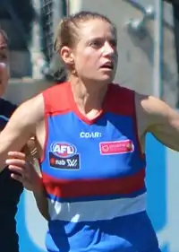 Kate Tyndall (born 12 November 1983) is an Australian rules footballer who played for the Western Bulldogs in the AFL Women's competition. Tyndal was drafted by the Western Bulldogs with their 15th selection and 117th overall in the 2016 AFL Women's draft.[1] She made her debut in the thirty-two point win against Fremantle at VU Whitten Oval in the opening round of the 2017 season.[2] She played every match in her debut season to finish with seven games.[3] She was delisted at the conclusion of the 2017 season.[4]