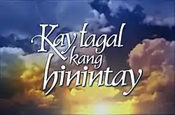 Kay Tagal Kang Hinintay (International title: The Long Wait / transl. "Waited For You in a Long Time") is a Philippine soap opera, produced by ABS-CBN and Star Cinema. It started July 8, 2002 and ended November 14, 2003. The critically acclaimed and top-rating teleserye won the CMMA Best Drama Series and the PMPC Star Awards Best Primetime Drama Series. It is the first local soap opera that became a finalist to the Best Drama Series category of the International Emmy Awards. It was also part of the top five drama series of the Asian TV Awards.