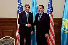 The Strategic Partnership Dialogue is a bilateral dialogue between Kazakhstan and the United States covering wide-ranging discussions on bilateral and regional issues. The first SPD was held in Washington on April 9–10, 2012;[13] the second was held in Washington on July 9, 2013. Kazakhstan Foreign Minister Erlan Idrissov and U.S. Secretary of State John Kerry are the co-chairs the Strategic Partnership Dialogue.[14]