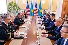 On December 10, 2014 U.S. Secretary of State John Kerry and Kazakhstan's Foreign Minister Erlan Idrissov co-chaired the third meeting of the Strategic Partnership Dialogue in Washington DC.[39] The two sides highlighted the robust and growing bilateral ties between Kazakhstan and the United States.[39] The wide-ranging discussions on bilateral and regional issues in the Strategic Partnership Dialogue included the following: partnership on global issues; nonproliferation; democracy, human rights, and development; trade, investment, and energy; Afghanistan and regional integration; security and law enforcement cooperation; military cooperation; education, science, and technology partnership; development in humanitarian assistance; EXPO-2017.[39]