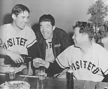 ![]() Inao (center) with teammate Yasumitsu Toyoda(left) and manager Osamu Mihara during the 1956 Japan Series | |||
