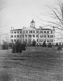 Kee Mar College consisted of 11 acres (4.5 ha) centrally located on high ground in Hagerstown with a view of the Cumberland Valley.[6][1] From its buildings, one could view the Blue Ridge Mountains, Crampton's Gap, and South Mountain. The buildings comprised a main college building, a music hall, and a large auditorium. These were all heated by steam and lighted by gas and electricity. The campus contained ten acres (4.0 ha) of forested land containing a mix of shrubbery, evergreens, and maples.[4] The main hall exhibited Romanesque architecture and landscaped gardens.[1] The campus was designed by a Baltimore architect and a Philadelphia landscape gardener.[1] The auditorium was constructed in 1894.[1]