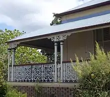 The verandah has paired timber posts with square capitals and decorative timber valances. It is covered by a curved corrugated iron roof, and has a wrought iron balustrade. The northern Roderick St elevation has a small front yard and a modest entrance (currently not used) consisting of rendered masonry stairs and a timber arch spanning between posts which has the words "The Manse" are inscribed upon it. This northern elevation has timber louvred shutters, while the west and east elevations have glazed timber doors with glazed fanlights above. The building sits on a brick screen base. Two tall rendered masonry chimneys and a metal ventilator rise above the ridge of the roof.[1]