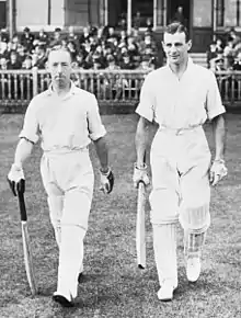 In the First Victory Test, the Australian Servicemen scraped home by six wickets with only two balls and minutes to spare. The last pre-war series between England and Australia in 1938 had been an attritional and hard-nosed contest, but in the afterglow of the war victory, the cricketers played flamboyantly with abandon in front of packed crowds. The attractive, attacking style of play was widely praised by commentators and the match raised £1,935 for war relief charities.[11][12] England then levelled the series by winning the Second Victory Test at Bramall Lane, Sheffield with a hard-fought battle, by 41 runs.[13] Australia won the Third Victory Test by four wickets late on the final day and drew the Fourth Victory Test at Lord's. That would have been the end of the series, but because of the record attendance of 93,000 at Lord's, another match was appended.[14][15] England drew the series by winning the Fifth Victory Test in front of another capacity crowd. The Victory Tests were regarded as an outstanding success, with a total attendance of 367,000 and bright and attacking play.[16]