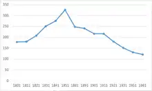 As the graph shows, the population had increased from 1801 when it was 179 to the year 1851 when it was 326 and this was the peak population of Kelshall within this time period. From this year it then slowly decreased and the lowest the population stood at was 122 in 1961. According to the 2001 census, the population stood at 151. 79 of these people were married and that was their first marriage. 43 people were single and had never been married, while 9 people had been remarried.[16] The 2011 census shows a population of 163.[1]