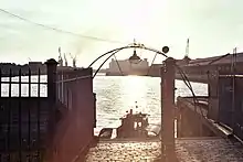 On the opposide side of the expressway (accessible via a pedestrian/cycle bridge), in 2017 the landmark pumphouse which once controlled entry to the Queen's Dock, then served as a visitor attraction for Glasgow's maritime heritage featuring the Glenlee (ship),[28] was converted into a new distillery.[29][30] In 2011, the maritime heritage centre (and the Glenlee) had moved to the new Riverside Museum located on the site of the Inglis shipyard.[12]