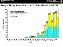 In September 2007, Corpus Christi, Texas, wildlife officials found a record of 128 Kemp's ridley sea turtle nests on Texas beaches, including 81 on North Padre Island (Padre Island National Seashore) and four on Mustang Island. The figure was exceeded in each of the following 7 years (see graph to 2013, provisional figures for 2014 as at July, 118.[27]). Wildlife officials released 10,594 Kemp's ridley hatchlings along the Texas coast that year. The turtles are popular in Mexico, as boot material and food.[28]