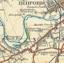 Kempston gravel pit railway was a narrow-gauge tramway which connected a gravel pit in the Hill Grounds area of Kempston, Bedfordshire to Bedford Road.[1] There are a small number of records of its operation in the late 1910s and 1920s and perhaps some years early. The terminus lay by the entrance to the Robert Bruce School site on what is now Bedford Road.[2]