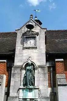 Kemsing was the birthplace, in between AD 961 and 964, of Saint Edith of Wilton, a daughter of the Anglo-Saxon King Edgar I. The well at the centre of the village is dedicated to her, a plaque on the wall recording the local legend that her saintly presence has given the water healing properties. The historic village centre area around the well includes the war memorial of 1921 (Grade II listed[3] by the architect Godfrey Pinkerton), a cluster of picturesque cottages and St. Edith's Hall of 1911 (Grade II listed[4] by the architect Godfrey Pinkerton), the front of which is adorned with a statue of the saint and a clock which chimes the hours and bears the inscription: