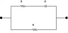 Where and are the resistances at zero frequency (i.e. DC) and infinity, respectively. is often referred to as the characteristic frequency. The characteristic frequency is not the same when the analysis is carried out in terms of the complex permittivity. A simple interpretation of the above equation is in terms of a circuit where a resistance is in series with a capacitor and this combination is placed in parallel with a resistance . In this case and . It can be shown that is given by