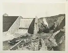 Before constructing the existing Kensico Dam, the old Kensico Dam had to be removed; this began in 1911.[7] The construction of the dam began in 1913 and was concluded in 1917—three years ahead of schedule—at a cost of more than $15,000,000.[8][9] The dam is 1,843 feet (562 m) long. It stands 307 feet (94 m) above its foundation and contains 1 million cubic feet (28,000 m3) of masonry—as much masonry as the Egyptians used to build some of the pyramids. In one month, 2.5 million cubic yards of concrete were poured into blocks,[10][11] which had to cure for three months before being swung onto the rising hyperbolic pile of dam. The dam is able to hold back about 30 billion US gallons (110,000,000 m3) of water.