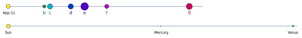 ![]() Relative size and positions of the 6 planets of Kepler-11, and of the innermost Solar System for comparison. The diameters of the planets (but not of the stars) are scaled up by a factor of 50. |