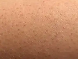 Keratosis pilaris (KP) (also follicular keratosis, lichen pilaris, or colloquially chicken skin[1]) is a common, autosomal dominant, genetic condition of the skin's hair follicles characterized by the appearance of possibly itchy, small, gooseflesh-like bumps, with varying degrees of reddening or inflammation.[2] It most often appears on the outer sides of the upper arms (the forearms can also be affected), thighs, face, back, and buttocks;[2] KP can also occur on the hands, and tops of legs, sides, or any body part except glabrous (hairless) skin (like the palms or soles of feet).[3] Often the lesions can appear on the face, which may be mistaken for acne.[4]