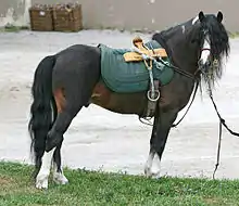 Kerry Bog Ponies were historically known in Ireland as "hobbies", possibly derived from the Gaelic practice of obaireacht, or the calling out of "Hup, Hup" to attract a pony back to the farmyard.[3] It is considered one of the mountain and moorland pony breeds from Britain and Ireland.[4] A 2006 study using mitochondrial DNA found that the Kerry Bog Pony is not closely related to the other two native Irish breeds, the Irish Draught and the Connemara pony. It has a rare haplogroup more closely related to other small horse breeds found in western Europe, including the Shetland pony and Icelandic horse.[5] A 2012 study found relationships between the Kerry Bog Pony and the Dartmoor Pony and Exmoor Pony breeds, and a lack of common ancestry with the Welsh Pony, as well as reinforcing the lack of relationship to the Connemara. The study also suggested that the Kerry Bog Pony population had some amount of crossbreeding with other mountain and moorland breeds as part of the initial attempts to increase the population in the 1990s.[4] The Kerry Bog Pony may have been one of several breeds that contributed to the development of the Gypsy Vanner horse (also known as the Irish Cob).[6]