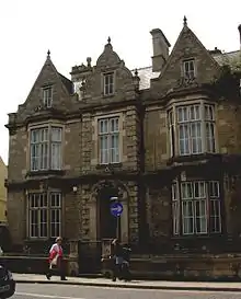 No. 62 Southgate was built by the local contractor Charles Kirk for himself some time before 1850. Constructed to a Jacobean style, the stone house spans three storeys with three gables, the central one being moulded. Between canted windows on either side, the central section projects forward with quoins and includes an arched doorway with pilasters. Iron rails atop a stone wall separate the house from the street, and steps lead up to the doorway. Two pre-Conquest stone fragments, likely 11th century, are inlaid into a wall.[81]