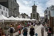 Keswick was granted a charter for a market in 1276 by Edward I. This market has an uninterrupted history lasting for more than 700 years.[22] The pattern of buildings around the market square remained broadly the same from this period until at least the late 18th century, with houses – originally timber-framed – fronting the square, and sturdily enclosed gardens or yards at the back. According to local tradition these stout walls and the narrow entrances to the yards were for defence against marauding Scots. In the event it appears that the town escaped such attacks, Scottish raiders finding richer and more accessible targets at Carlisle and the fertile Eden Valley, well to the north of Keswick.[23]