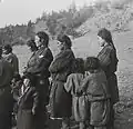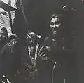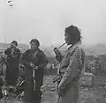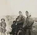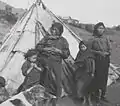 Group of Kets around a campfire. The people in the background wearing fur hats are Russians.