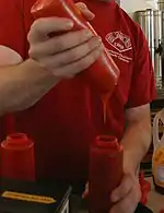 Ketchup is a non-Newtonian fluid, meaning that its viscosity changes under stress and is not constant. It is a shear thinning fluid which means its viscosity decreases with increased shear stress.[43] The equation used to designate a Non-Newtonian fluid is as follows: . This equation represents apparent viscosity where apparent viscosity is the shear stress divided by shear rate. Viscosity is dependent on stress. This is apparent when you shake a bottle of tomato sauce/ketchup so it becomes liquid enough to squirt out. Its viscosity decreased with stress.[44]