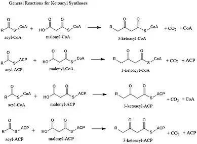 Ketoacyl synthases (KSs) catalyze the condensation reaction of acyl-CoA or acyl-acyl ACP with malonyl-CoA to form 3-ketoacyl-CoA or with malonyl-ACP to form 3-ketoacyl-ACP. This reaction is a key step in the fatty acid synthesis cycle, as the resulting acyl chain is two carbon atoms longer than before. KSs exist as individual enzymes, as they do in type II fatty acid synthesis and type II polyketide synthesis, or as domains in large multidomain enzymes, such as type I fatty acid synthases (FASs) and polyketide synthases (PKSs). KSs are divided into five families: KS1, KS2, KS3, KS4, and KS5.[1]