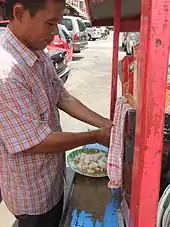 Ketoprak is a typical street food. It was originally popular around the Jakarta area but has spread throughout Java. The seller prepares the ingredients at home and mixes them in front of the customers as they place their orders.[5] It is sold in individual portions from small stalls or carts along the street. The cook usually asks the customer their preference on the degree of spiciness: mild, medium, hot or extra hot. The spiciness corresponds to the amount of chili used. The price range is about IDR 8.000 to 15.000 according to outlets and ingredients included.[6] Sometimes, hard boiled egg might be added.
