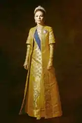 Empress Farah Pahlavi wearing one of the haute couture court robes designed by Keyvan Khosrovani as part of his collection for the Royal Household.